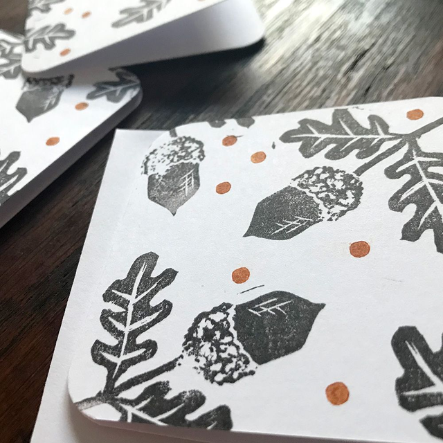 Acorn and oak leaf design hand printed in a warm brown ink.