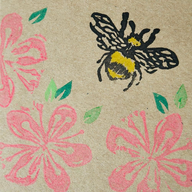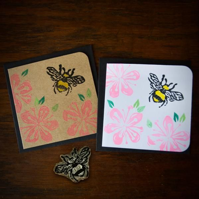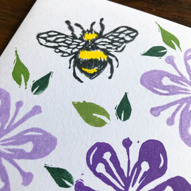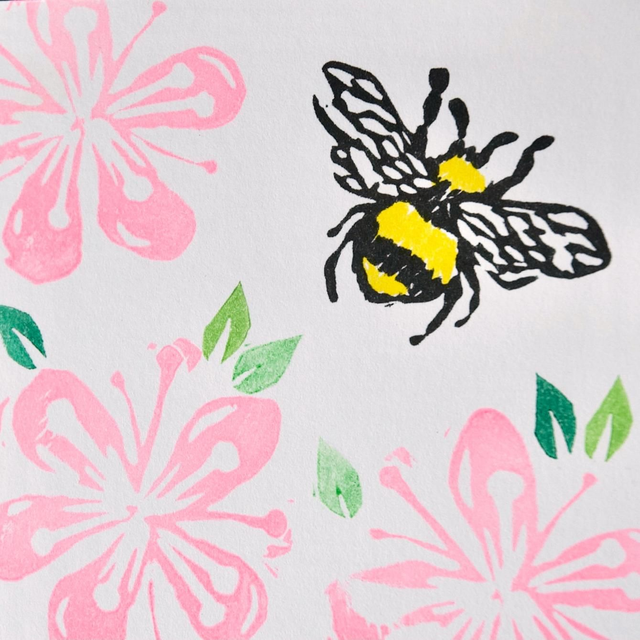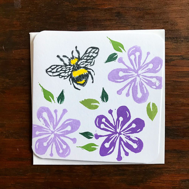 Blossom flowers and leaves with a bee design hand printed on a small square card.