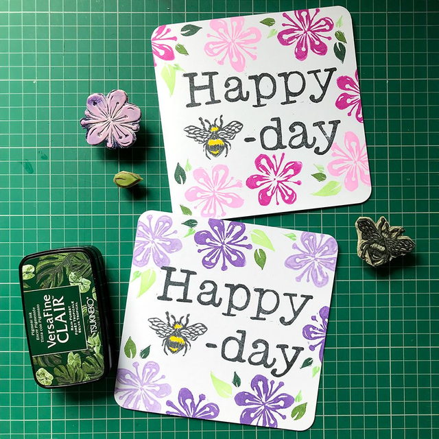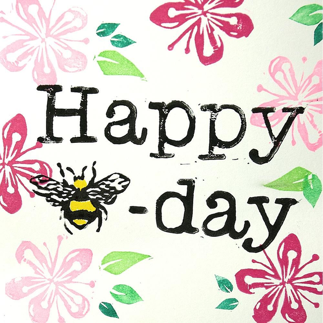 Birthday card design of blossom and leaves with a bee based pun hand printed on a white card.