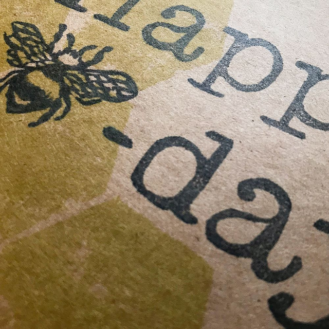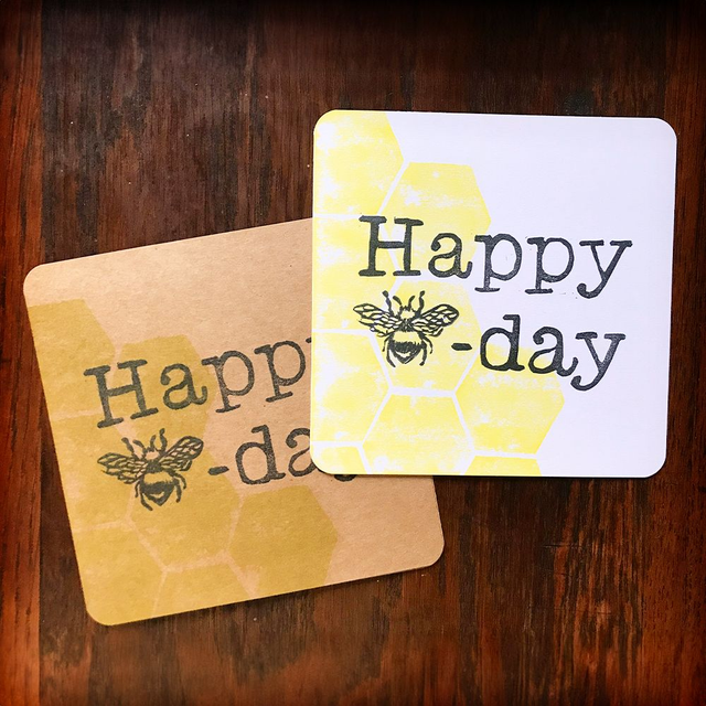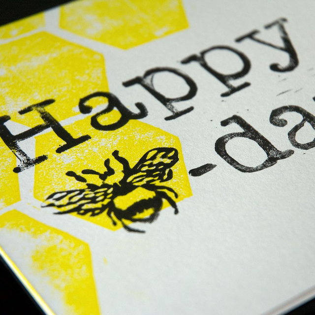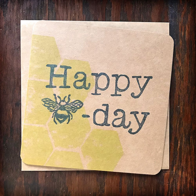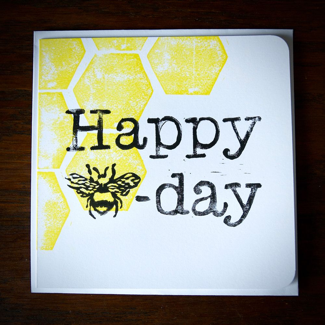 Birthday card design of yellow honeycomb with a bee based pun hand printed on white or kraft card.