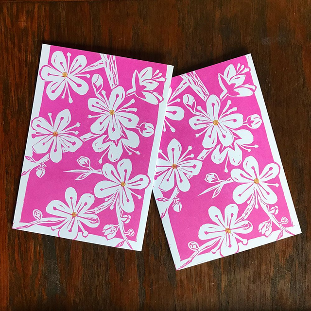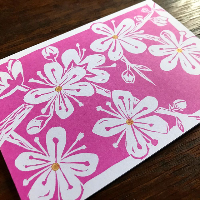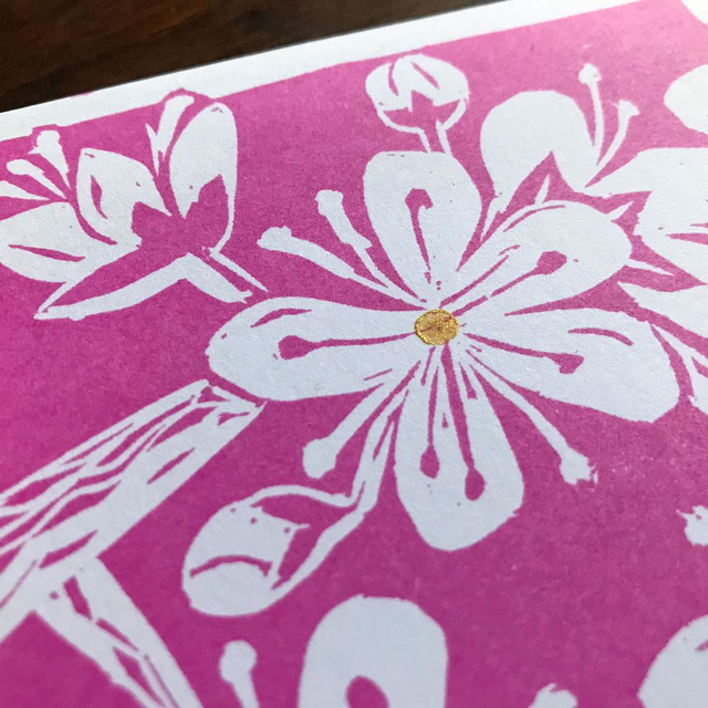 Blossom design printed with pink ink and embellished with a golden centre dot on a white card.