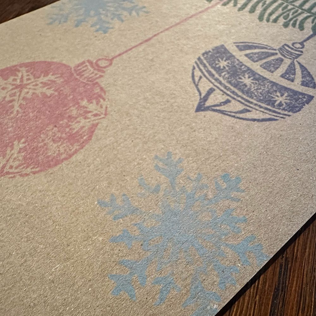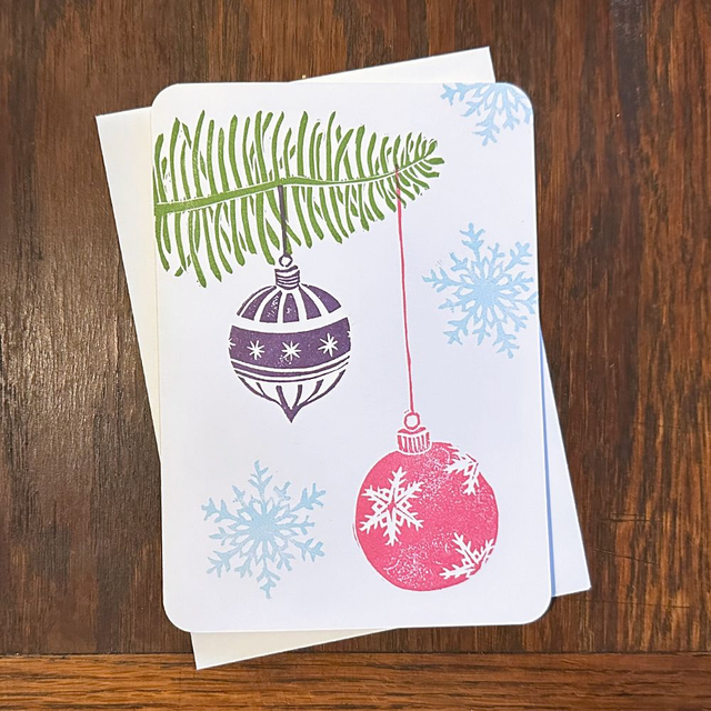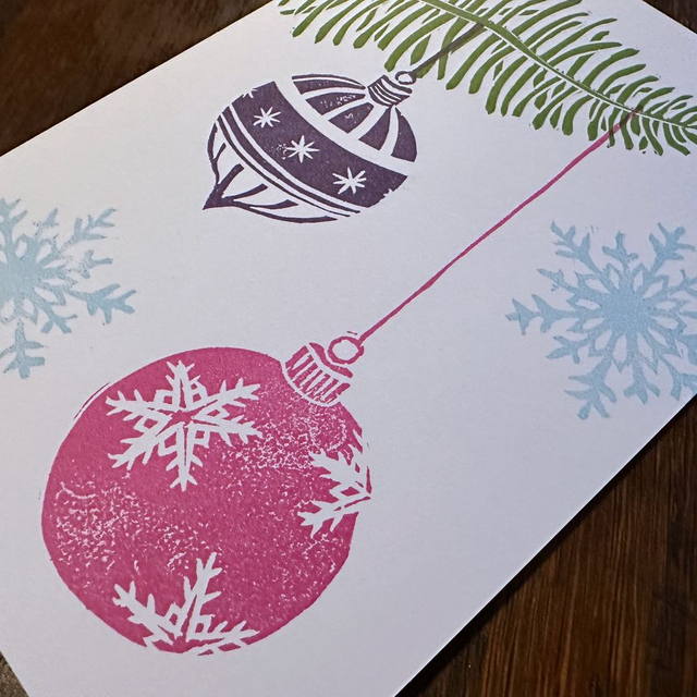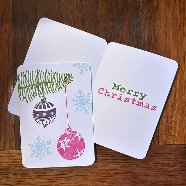 Colourful decorative baubles hanging from a pine tree branch hand printed on a white or kraft card. 'Merry Christmas' is stamped inside.