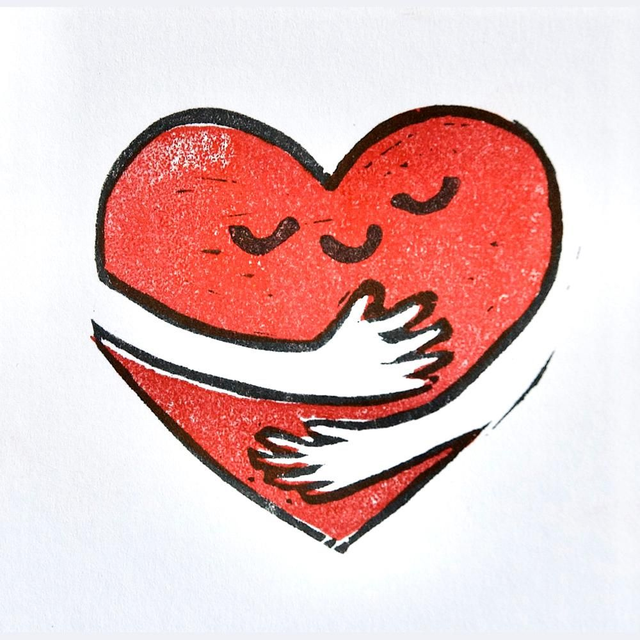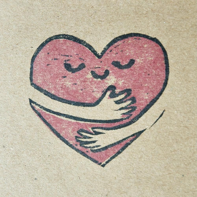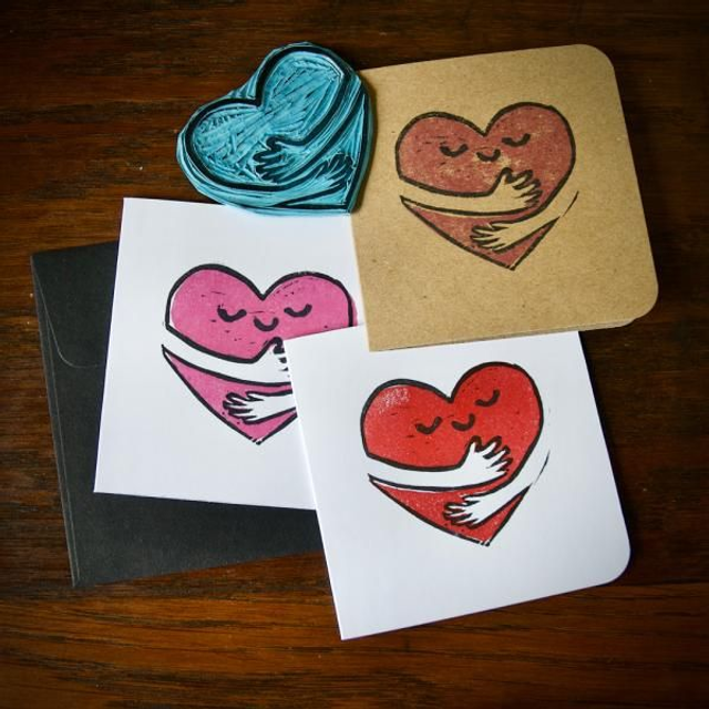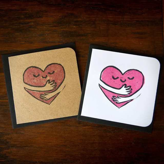 This cute hugging heart design is hand printed on white or kraft card.