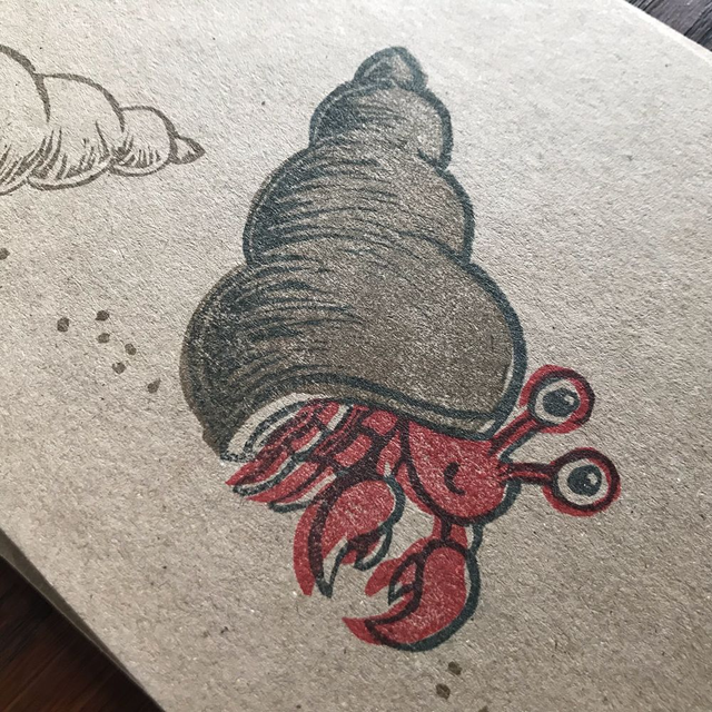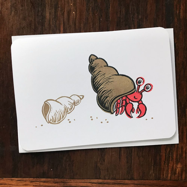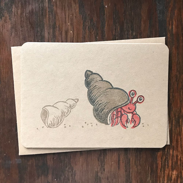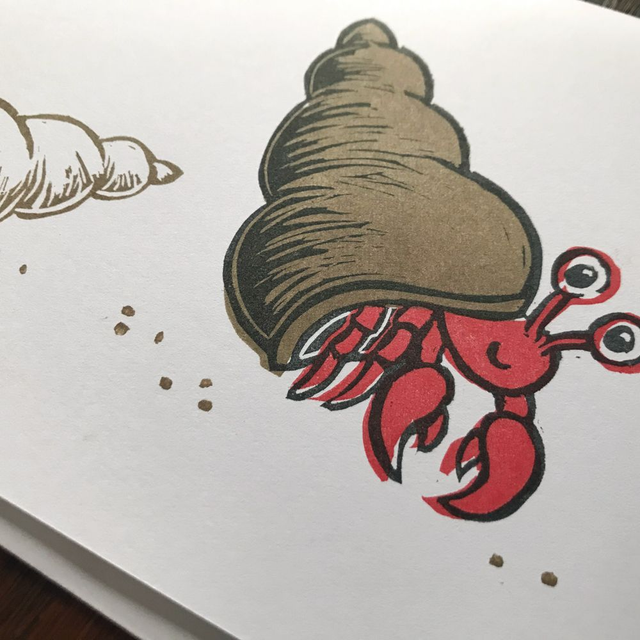 A cute hermit crab has moved home to a much better shell, hand carved and printed on kraft or white card.