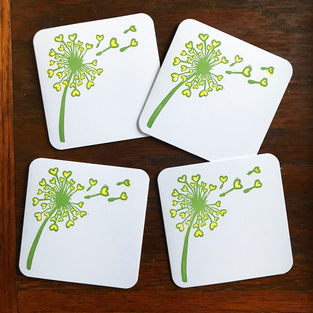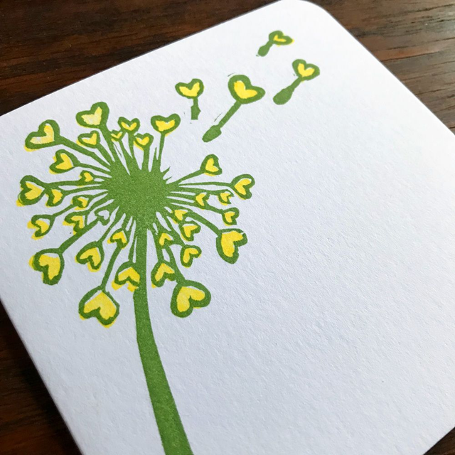 Sentimental heart shaped dandelion seeds blowing in the wind printed in green and yellow ink.