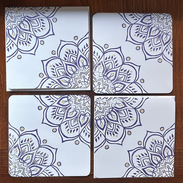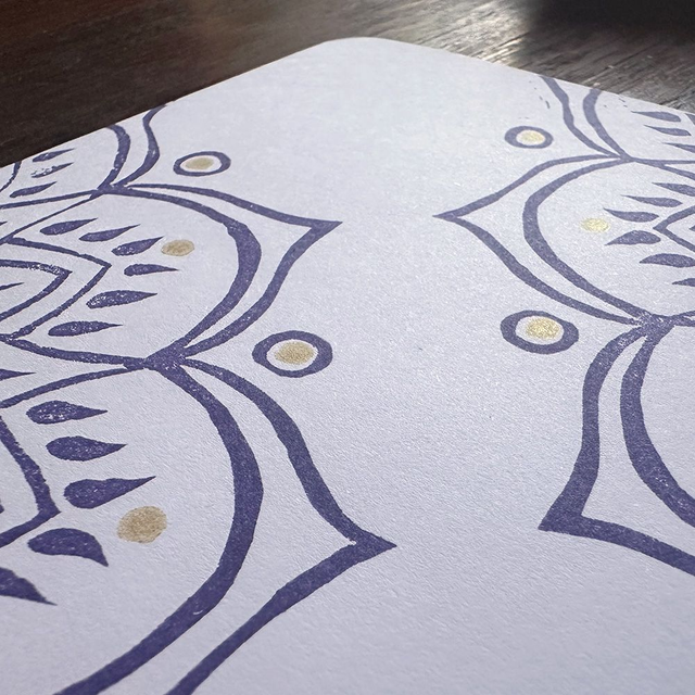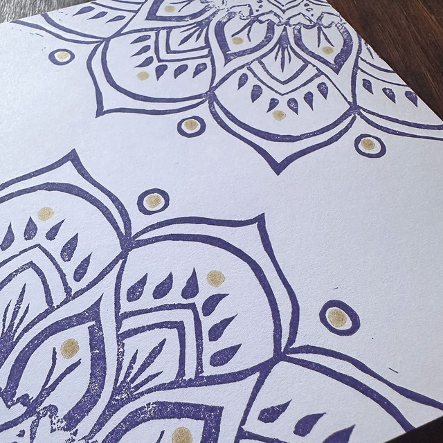 Intricate mandala design printed on white in dark purple ink with gold dot details.