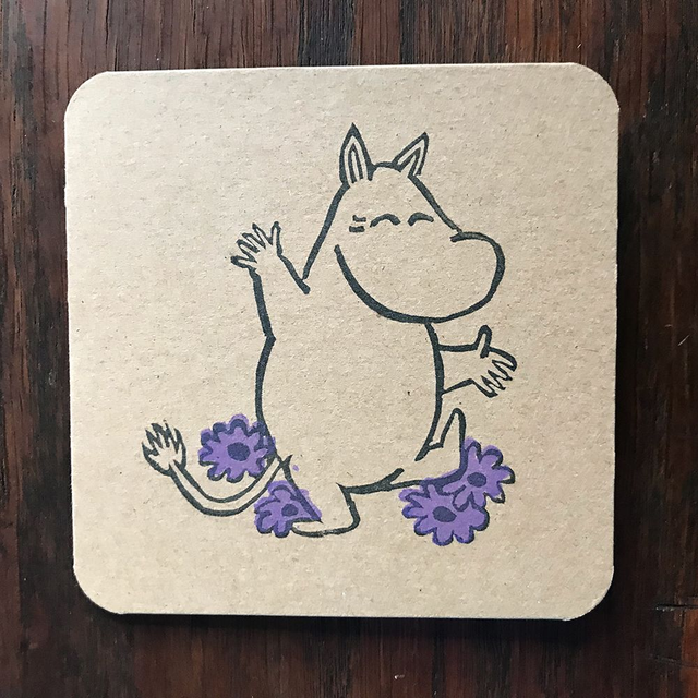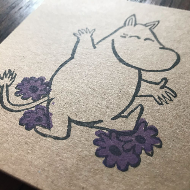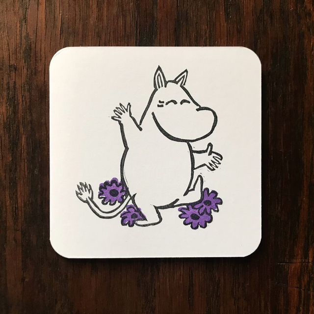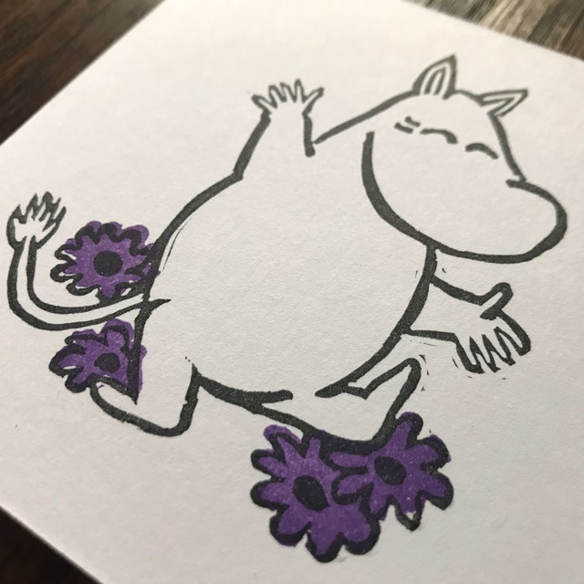 Moomintroll is happy amongst the flowers. A simple but cute design hand printed ink on white or kraft card.