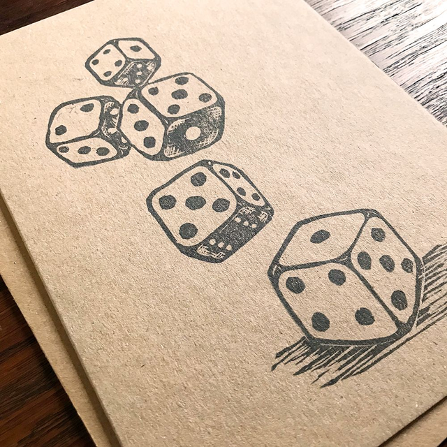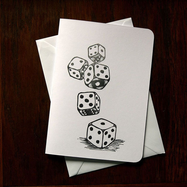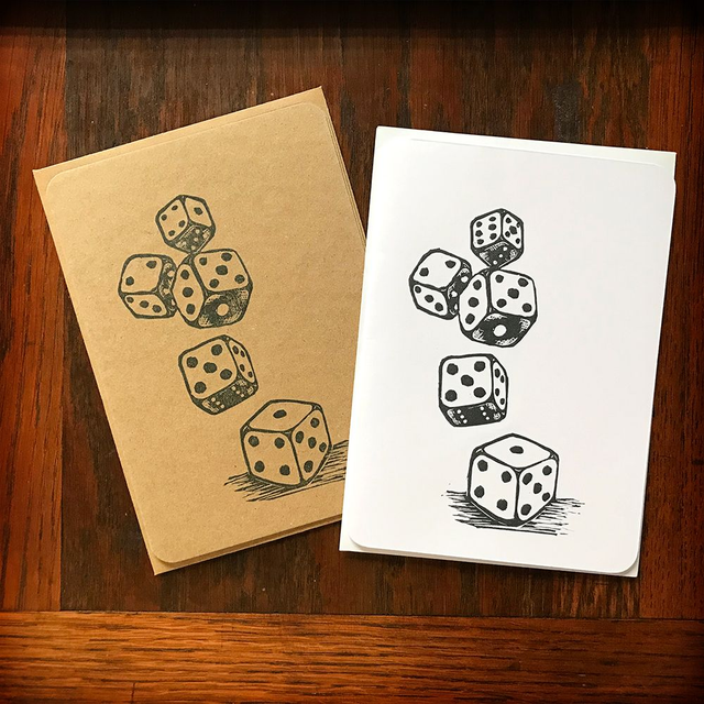 Inspired by Yahtzee; a hand carved design of five dice in action on white or kraft card.