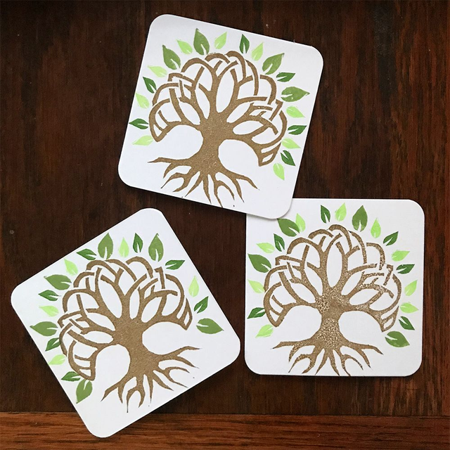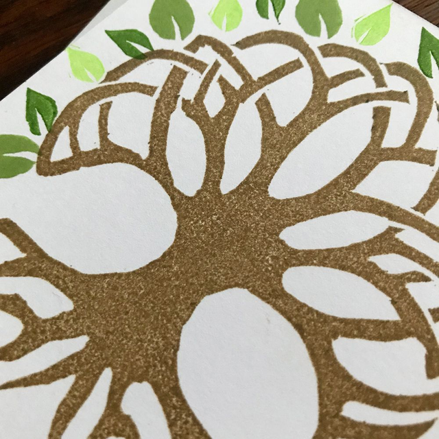 Hand printed tree of life design with little leaves in earthy colours